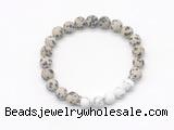 Details: Gemstone mala bracelet: 8mm round matte dalmatian jasper & matte white howlite meditation yoga bracelet jewelry wholesale (you can choose different 5 beads & spacer, if you don’t need the spacer, please choose No) Item: CGB8298 Material: matte wooden jasper, matte white howlite & alloy spacer Color: See image Size (mm): 8mm Length (inch): approx 7.5 inches(Default) You can choose 6.5 inches; 7 inches; 8 inches or 8.5 inches Quantity Discount Pricing: 1 – 4: No 5 – 49: 95% 50 – 99: 90% 100+: 85% The listed price is for 1 piece bracelet