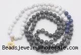 GMN6208 Knotted matte white howlite & mixed gemstone 108 beads mala necklace with tassel & charm
