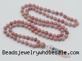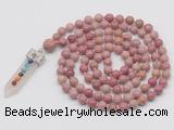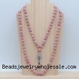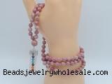 Details: Hand-knotted jasper mala necklaces: 108 8mm/10mm round pink wooden fossil jasper beads with 1 12mm guru bead and rose quartz pendant (you can choose different pendants) Item: GMN1440 Material: No.1(8mm: 108 8mm pink wooden fossil jasper beads, 12mm guru bead & rose quartz pendant No.2(10mm: 108 10mm pink wooden fossil jasper beads, 12mm guru bead & rose quartz pendant Color: See image Length (inch): Necklace length: No.1(8mm: approx 37 - 40 inches (Not including guru bead & pendant) No.2(10mm: approx 46 - 50 inches (Not including guru bead & pendant) Pendants: #1 - #8: approx 20*50mm – 22*55mm #9 - #23: approx 16*50mm – 16*55mm #24 - #30: approx 17*55mm – 17*58mm #31 - #39: approx 25*68mm – 25*70mm Quantity Discount Pricing: 1 – 4: None 5 – 49: 95% 50 – 99: 90% 100+: 85% This mala is available in both 8mm and 10mm beads, The listed price is for 1 piece 8mm mala necklace