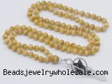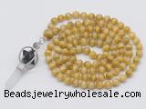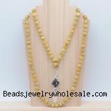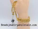 Details: Hand-knotted tiger eye mala necklaces: 108 8mm/10mm round grade AA golden tiger eye beads with 1 12mm guru bead and obsidian & white crystal pendant (you can choose different pendants) Item: GMN1486 Material: No.1(8mm: 108 8mm golden tiger eye beads, 12mm guru bead & white crystal pendant No.2(10mm: 108 10mm golden tiger eye beads, 12mm guru bead & white crystal pendant Color: See image Length (inch): Necklace length: No.1(8mm: approx 37 - 40 inches (Not including guru bead & pendant) No.2(10mm: approx 46 - 50 inches (Not including guru bead & pendant) Pendants: #1 - #8: approx 20*50mm – 22*55mm #9 - #23: approx 16*50mm – 16*55mm #24 - #30: approx 17*55mm – 17*58mm #31 - #39: approx 25*68mm – 25*70mm Quantity Discount Pricing: 1 – 4: None 5 – 49: 95% 50 – 99: 90% 100+: 85% This mala is available in both 8mm and 10mm beads, The listed price is for 1 piece 8mm mala necklace