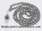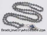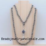 Details: Hand-knotted labradorite mala necklaces: 108 8mm/10mm round grade AA labradorite beads with 1 12mm guru bead and sodalite & white crystal pendant (you can choose different pendants) Item: GMN1546 Material: No.1(8mm: 108 8mm labradorite beads, 12mm guru bead And sodalite & white crystal pendant No.2(10mm: 108 10mm labradorite beads, 12mm guru bead And sodalite & white crystal pendant Color: See image Length (inch): Necklace length: No.1(8mm: approx 37 - 40 inches (Not including guru bead & pendant) No.2(10mm: approx 46 - 50 inches (Not including guru bead & pendant) Pendants: #1 - #8: approx 20*50mm – 22*55mm #9 - #23: approx 16*50mm – 16*55mm #24 - #30: approx 17*55mm – 17*58mm #31 - #39: approx 25*68mm – 25*70mm Quantity Discount Pricing: 1 – 4: None 5 – 49: 95% 50 – 99: 90% 100+: 85% This mala is available in both 8mm and 10mm beads, The listed price is for 1 piece 8mm mala necklace
