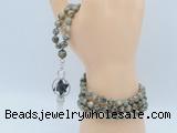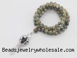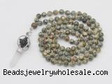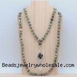 Details: Hand-knotted rhyolite mala necklaces: 108 8mm/10mm round rhyolite beads with 1 12mm guru bead and obsidian & white crystal pendant (you can choose different pendants) Item: GMN1549 Material: No.1(8mm: 108 8mm apatite beads, 12mm guru bead And obsidian & white crystal pendant No.2(10mm: 108 10mm apatite beads, 12mm guru bead And obsidian & white crystal pendant Color: See image Length (inch): Necklace length: No.1(8mm: approx 37 - 40 inches (Not including guru bead & pendant) No.2(10mm: approx 46 - 50 inches (Not including guru bead & pendant) Pendants: #1 - #8: approx 20*50mm – 22*55mm #9 - #23: approx 16*50mm – 16*55mm #24 - #30: approx 17*55mm – 17*58mm #31 - #39: approx 25*68mm – 25*70mm Quantity Discount Pricing: 1 – 4: None 5 – 49: 95% 50 – 99: 90% 100+: 85% This mala is available in both 8mm and 10mm beads, The listed price is for 1 piece 8mm mala necklace