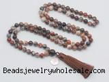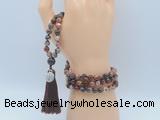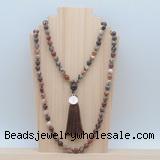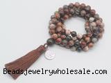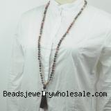Details: Hand-knotted jasper mala necklaces: 108 8mm/10mm round brecciated jasper gemstone beads with 1 12mm guru bead and satin tassel & alloy charm (you can choose different tassels & charms) Item: GMN1891 Material: No.1(8mm: 108 8mm brecciated jasper beads, 12mm guru bead, satin tassel & charm No.2(10mm: 108 10mm brecciated jasper beads, 12mm guru bead, satin tassel & charm Color: See image Length (inch): Necklace length: No.1(8mm: approx 37 - 40 inches (Not including guru bead & tassel) No.2(10mm: approx 46 - 50 inches (Not including guru bead & tassel) Quantity Discount Pricing: 1 – 4: None 5 – 49: 95% 50 – 99: 90% 100+: 85% This mala is available in both 8mm and 10mm beads, The listed price is for 1 piece 8mm mala necklace