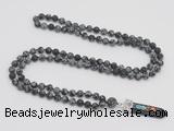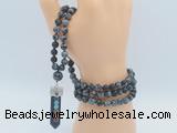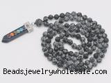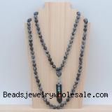Details: Hand-knotted obsidian mala necklaces: 108 8mm/10mm round matte snowflake obsidian beads with 1 12mm guru bead and blue goldstone pendant (you can choose different pendants) Item: GMN2614 Material: No.1(8mm: 108 8mm matte snowflake obsidian beads, 12mm guru bead & blue goldstone pendant No.2(10mm: 108 10mm matte snowflake obsidian beads, 12mm guru bead & blue goldstone pendant Color: See image Length (inch): Necklace length: No.1(8mm: approx 37 - 40 inches (Not including guru bead & pendant) No.2(10mm: approx 46 - 50 inches (Not including guru bead & pendant) Pendants: #1 - #8: approx 20*50mm – 22*55mm #9 - #23: approx 16*50mm – 16*55mm #24 - #30: approx 17*55mm – 17*58mm #31 - #39: approx 25*68mm – 25*70mm Quantity Discount Pricing: 1 – 4: None 5 – 49: 95% 50 – 99: 90% 100+: 85% This mala is available in both 8mm and 10mm beads, The listed price is for 1 piece 8mm mala necklace