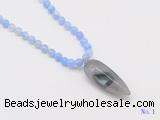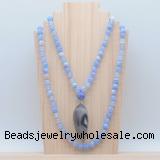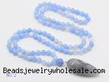 Details: Hand-knotted agate mala necklaces: 108 8mm/10mm round blue banded agate beads with agate pendant/12mm guru bead and agate pendant (you can choose different pendants, but there will be tiny different in shape & color, we will make the jewelry randomly according to our stock) Item: GMN4008 Material: No.1: 8mm: 108 8mm blue banded agate beads & agate pendant 10mm: 108 10mm blue banded agate beads & agate pendant No.2: 8mm: 108 8mm blue banded agate beads, 12mm guru bead & agate pendant 10mm: 108 10mm blue banded agate beads, 12mm guru bead & agate pendant Color: See image Length (inch): Necklace length: 8mm: approx 37 - 40 inches (Not including guru bead & pendant) 10mm: approx 46 - 50 inches (Not including guru bead & pendant) Pendants: approx 18*50mm – 25*60mm Quantity Discount Pricing: 1 – 4: None 5 – 49: 95% 50 – 99: 90% 100+: 85% This mala is available in both 8mm and 10mm beads, The listed price is for 1 piece 8mm mala necklace