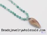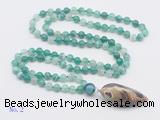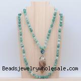 Details: Hand-knotted agate mala necklaces: 108 8mm/10mm round green banded agate beads with rainforest agate pendant/12mm guru bead and rainforest agate pendant (you can choose different pendants, but there will be tiny different in shape & color, we will make the jewelry randomly according to our stock) Item: GMN4010 Material: No.1: 8mm: 108 8mm green banded agate beads & rainforest agate pendant 10mm: 108 10mm green banded agate beads & rainforest agate pendant No.2: 8mm: 108 8mm green banded agate beads, 12mm guru bead & rainforest agate pendant 10mm: 108 10mm green banded agate beads, 12mm guru bead & rainforest agate pendant Color: See image Length (inch): Necklace length: 8mm: approx 37 - 40 inches (Not including guru bead & pendant) 10mm: approx 46 - 50 inches (Not including guru bead & pendant) Pendants: approx 18*50mm – 25*60mm Quantity Discount Pricing: 1 – 4: None 5 – 49: 95% 50 – 99: 90% 100+: 85% This mala is available in both 8mm and 10mm beads, The listed price is for 1 piece 8mm mala necklace