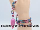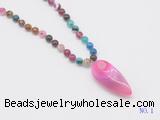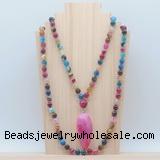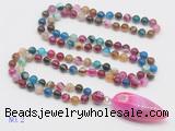 Details: Hand-knotted agate mala necklaces: 108 8mm/10mm round mixed banded agate beads with agate pendant/12mm guru bead and agate pendant (you can choose different pendants, but there will be tiny different in shape & color, we will make the jewelry randomly according to our stock) Item: GMN4011 Material: No.1: 8mm: 108 8mm mixed banded agate beads & agate pendant 10mm: 108 10mm mixed banded agate beads & agate pendant No.2: 8mm: 108 8mm mixed banded agate beads, 12mm guru bead & agate pendant 10mm: 108 10mm mixed banded agate beads, 12mm guru bead & agate pendant Color: See image Length (inch): Necklace length: 8mm: approx 37 - 40 inches (Not including guru bead & pendant) 10mm: approx 46 - 50 inches (Not including guru bead & pendant) Pendants: approx 18*50mm – 25*60mm Quantity Discount Pricing: 1 – 4: None 5 – 49: 95% 50 – 99: 90% 100+: 85% This mala is available in both 8mm and 10mm beads, The listed price is for 1 piece 8mm mala necklace
