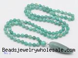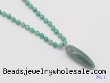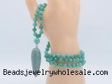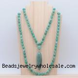 Details: Hand-knotted agate mala necklaces: 108 8mm/10mm round peafowl agate beads with green aventurine pendant/12mm guru bead and green aventurine pendant (you can choose different pendants, but there will be tiny different in shape & color, we will make the jewelry randomly according to our stock) Item: GMN4012 Material: No.1: 8mm: 108 8mm peafowl agate beads & green aventurine pendant 10mm: 108 10mm peafowl agate beads & green aventurine pendant No.2: 8mm: 108 8mm peafowl agate beads, 12mm guru bead & green aventurine pendant 10mm: 108 10mm peafowl agate beads, 12mm guru bead & green aventurine pendant Color: See image Length (inch): Necklace length: 8mm: approx 37 - 40 inches (Not including guru bead & pendant) 10mm: approx 46 - 50 inches (Not including guru bead & pendant) Pendants: approx 18*50mm – 25*60mm Quantity Discount Pricing: 1 – 4: None 5 – 49: 95% 50 – 99: 90% 100+: 85% This mala is available in both 8mm and 10mm beads, The listed price is for 1 piece 8mm mala necklace