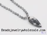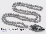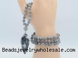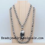 Details: Hand-knotted jasper mala necklaces: 108 8mm/10mm round grey picture jasper beads with black & white jasper pendant/12mm guru bead and black & white jasper jasper pendant (you can choose different pendants, but there will be tiny different in shape & color, we will make the jewelry randomly according to our stock) Item: GMN4022 Material: No.1: 8mm: 108 8mm grey picture jasper beads And black & white jasper pendant 10mm: 108 10mm grey picture jasper beads And black & white jasper pendant No.2: 8mm: 108 8mm grey picture jasper beads, 12mm guru bead And black & white jasper pendant 10mm: 108 10mm grey picture jasper beads, 12mm guru bead And black & white jasper pendant Color: See image Length (inch): Necklace length: 8mm: approx 37 - 40 inches (Not including guru bead & pendant) 10mm: approx 46 - 50 inches (Not including guru bead & pendant) Pendants: approx 18*50mm – 25*60mm Quantity Discount Pricing: 1 – 4: None 5 – 49: 95% 50 – 99: 90% 100+: 85% This mala is available in both 8mm and 10mm beads, The listed price is for 1 piece 8mm mala necklace