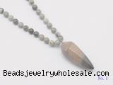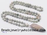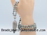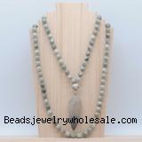 Details: Hand-knotted jasper mala necklaces: 108 8mm/10mm round artistic jasper beads with polychrome jasper pendant/12mm guru bead and polychrome jasper pendant (you can choose different pendants, but there will be tiny different in shape & color, we will make the jewelry randomly according to our stock) Item: GMN4023 Material: No.1: 8mm: 108 8mm artistic jasper beads & polychrome jasper pendant 10mm: 108 10mm artistic jasper beads & polychrome jasper pendant No.2: 8mm: 108 8mm artistic jasper beads, 12mm guru bead & polychrome jasper pendant 10mm: 108 10mm artistic jasper beads, 12mm guru bead & polychrome jasper pendant Color: See image Length (inch): Necklace length: 8mm: approx 37 - 40 inches (Not including guru bead & pendant) 10mm: approx 46 - 50 inches (Not including guru bead & pendant) Pendants: approx 18*50mm – 25*60mm Quantity Discount Pricing: 1 – 4: None 5 – 49: 95% 50 – 99: 90% 100+: 85% This mala is available in both 8mm and 10mm beads, The listed price is for 1 piece 8mm mala necklace