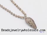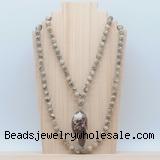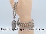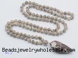 Details: Hand-knotted feldspar mala necklaces: 108 8mm/10mm round feldspar beads with rainforest agate pendant/12mm guru bead and rainforest agate pendant (you can choose different pendants, but there will be tiny different in shape & color, we will make the jewelry randomly according to our stock) Item: GMN4025 Material: No.1: 8mm: 108 8mm feldspar beads & rainforest agate pendant 10mm: 108 10mm feldspar beads & rainforest agate pendant No.2: 8mm: 108 8mm feldspar beads, 12mm guru bead & rainforest agate pendant 10mm: 108 10mm feldspar beads, 12mm guru bead & rainforest agate pendant Color: See image Length (inch): Necklace length: 8mm: approx 37 - 40 inches (Not including guru bead & pendant) 10mm: approx 46 - 50 inches (Not including guru bead & pendant) Pendants: approx 18*50mm – 25*60mm Quantity Discount Pricing: 1 – 4: None 5 – 49: 95% 50 – 99: 90% 100+: 85% This mala is available in both 8mm and 10mm beads, The listed price is for 1 piece 8mm mala necklace