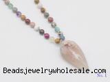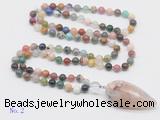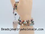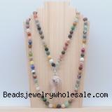 Details: Hand-knotted gemstone mala necklaces: 108 8mm/10mm round mixed gemstone beads with sakura agate pendant/12mm guru bead and sakura agate pendant (you can choose different pendants, but there will be tiny different in shape & color, we will make the jewelry randomly according to our stock) Item: GMN4038 Material: No.1: 8mm: 108 8mm mixed gemstone beads & sakura agate pendant 10mm: 108 10mm mixed gemstone beads & sakura agate pendant No.2: 8mm: 108 8mm mixed gemstone beads, 12mm guru bead & sakura agate pendant 10mm: 108 10mm mixed gemstone beads, 12mm guru bead & sakura agate pendant Color: See image Length (inch): Necklace length: 8mm: approx 37 - 40 inches (Not including guru bead & pendant) 10mm: approx 46 - 50 inches (Not including guru bead & pendant) Pendants: approx 18*50mm – 25*60mm Quantity Discount Pricing: 1 – 4: None 5 – 49: 95% 50 – 99: 90% 100+: 85% This mala is available in both 8mm and 10mm beads, The listed price is for 1 piece 8mm mala necklace