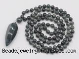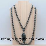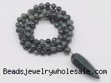 Details: Hand-knotted jasper mala necklaces: 108 8mm/10mm round kambaba jasper beads with moss agate pendant/12mm guru bead and moss agate jasper pendant (you can choose different pendants, but there will be tiny different in shape & color, we will make the jewelry randomly according to our stock) Item: GMN4082 Material: No.1: 8mm: 108 8mm kambaba jasper beads & moss agate pendant 10mm: 108 10mm kambaba jasper beads & moss agate pendant No.2: 8mm: 108 8mm kambaba jasper beads, 12mm guru bead & moss agate pendant 10mm: 108 10mm kambaba jasper beads, 12mm guru bead & moss agate pendant Color: See image Length (inch): Necklace length: 8mm: approx 37 - 40 inches (Not including guru bead & pendant) 10mm: approx 46 - 50 inches (Not including guru bead & pendant) Pendants: approx 18*50mm - 25*60mm Quantity Discount Pricing: 1 – 4: None 5 – 49: 95% 50 – 99: 90% 100+: 85% This mala is available in both 8mm and 10mm beads, The listed price is for 1 piece 8mm mala necklace