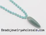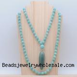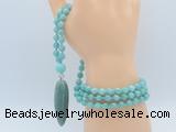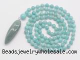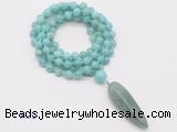 Details: Hand-knotted amazonite mala necklaces: 108 8mm/10mm round grade A amazonite beads with green aventurine pendant/12mm guru bead and green aventurine pendant (you can choose different pendants, but there will be tiny different in shape & color, we will make the jewelry randomly according to our stock) Item: GMN4085 Material: No.1: 8mm: 108 8mm amazonite beads & green aventurine pendant 10mm: 108 10mm amazonite beads & green aventurine pendant No.2: 8mm: 108 8mm amazonite beads, 12mm guru bead & green aventurine pendant 10mm: 108 10mm amazonite beads, 12mm guru bead & green aventurine pendant Color: See image Length (inch): Necklace length: 8mm: approx 37 - 40 inches (Not including guru bead & pendant) 10mm: approx 46 - 50 inches (Not including guru bead & pendant) Pendants: approx 18*50mm - 25*60mm Quantity Discount Pricing: 1 – 4: None 5 – 49: 95% 50 – 99: 90% 100+: 85% This mala is available in both 8mm and 10mm beads, The listed price is for 1 piece 8mm mala necklace