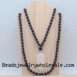Details: Hand-knotted tiger eye mala necklaces: 108 8mm/10mm round purple tiger eye beads with white crystal pendant/12mm guru bead and white crystal pendant (you can choose different pendants, but there will be tiny different in shape & color, we will make the jewelry randomly according to our stock) Item: GMN4090 Material: No.1: 8mm: 108 8mm purple tiger eye beads & white crystal pendant 10mm: 108 10mm purple tiger eye beads & white crystal pendant No.2: 8mm: 108 8mm purple tiger eye beads, 12mm guru bead & white crystal pendant 10mm: 108 10mm purple tiger eye beads, 12mm guru bead & white crystal pendant Color: See image Length (inch): Necklace length: 8mm: approx 37 - 40 inches (Not including guru bead & pendant) 10mm: approx 46 - 50 inches (Not including guru bead & pendant) Pendants: approx 18*50mm - 25*60mm Quantity Discount Pricing: 1 – 4: None 5 – 49: 95% 50 – 99: 90% 100+: 85% This mala is available in both 8mm and 10mm beads, The listed price is for 1 piece 8mm mala necklace