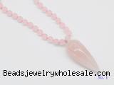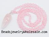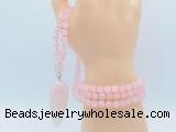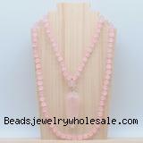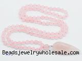 Details: Hand-knotted quartz mala necklaces: 108 8mm/10mm round matte rose quartz beads with rose quartz pendant/12mm guru bead and rose quartz pendant (you can choose different pendants, but there will be tiny different in shape & color, we will make the jewelry randomly according to our stock) Item: GMN4200 Material: No.1: 8mm: 108 8mm matte rose quartz beads & rose quartz pendant 10mm: 108 10mm matte rose quartz beads & rose quartz pendant No.2: 8mm: 108 8mm matte rose quartz beads, 12mm guru bead & rose quartz pendant 10mm: 108 10mm matte rose quartz beads, 12mm guru bead & rose quartz pendant Color: See image Length (inch): Necklace length: 8mm: approx 37 - 40 inches (Not including guru bead & pendant) 10mm: approx 46 - 50 inches (Not including guru bead & pendant) Pendants: approx 18*50mm – 25*60mm Quantity Discount Pricing: 1 – 4: None 5 – 49: 95% 50 – 99: 90% 100+: 85% This mala is available in both 8mm and 10mm beads, The listed price is for 1 piece 8mm mala necklace