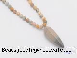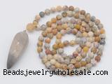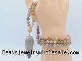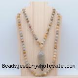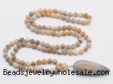 Details: Hand-knotted agate mala necklaces: 108 8mm/10mm round matte yellow crazy lace agate beads with polychrome jasper pendant/12mm guru bead and polychrome jasper pendant (you can choose different pendants, but there will be tiny different in shape & color, we will make the jewelry randomly according to our stock) Item: GMN4211 Material: No.1: 8mm: 108 8mm matte yellow crazy lace agate beads & polychrome jasper pendant 10mm: 108 10mm matte yellow crazy lace agate beads & polychrome jasper pendant No.2: 8mm: 108 8mm matte yellow crazy lace agate beads, 12mm guru bead & polychrome jasper pendant 10mm: 108 10mm matte yellow crazy lace agate beads, 12mm guru bead & polychrome jasper pendant Color: See image Length (inch): Necklace length: 8mm: approx 37 - 40 inches (Not including guru bead & pendant) 10mm: approx 46 - 50 inches (Not including guru bead & pendant) Pendants: approx 18*50mm – 25*60mm Quantity Discount Pricing: 1 – 4: None 5 – 49: 95% 50 – 99: 90% 100+: 85% This mala is available in both 8mm and 10mm beads, The listed price is for 1 piece 8mm mala necklace
