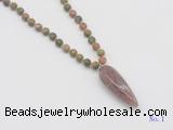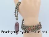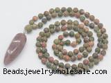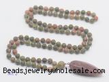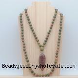 Details: Hand-knotted unakite mala necklaces: 108 8mm/10mm round matte unakite beads with strawberry quartz pendant/12mm guru bead and strawberry quartz pendant (you can choose different pendants, but there will be tiny different in shape & color, we will make the jewelry randomly according to our stock) Item: GMN4224 Material: No.1: 8mm: 108 8mm matte unakite beads & strawberry quartz pendant 10mm: 108 10mm matte unakite beads & strawberry quartz pendant No.2: 8mm: 108 8mm matte unakite beads, 12mm guru bead & strawberry quartz pendant 10mm: 108 10mm matte unakite beads, 12mm guru bead & strawberry quartz pendant Color: See image Length (inch): Necklace length: 8mm: approx 37 - 40 inches (Not including guru bead & pendant) 10mm: approx 46 - 50 inches (Not including guru bead & pendant) Pendants: approx 18*50mm – 25*60mm Quantity Discount Pricing: 1 – 4: None 5 – 49: 95% 50 – 99: 90% 100+: 85% This mala is available in both 8mm and 10mm beads, The listed price is for 1 piece 8mm mala necklace