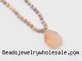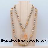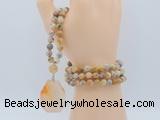 Details: Hand-knotted agate mala necklaces: 108 8mm/10mm round matte yellow crazy lace agate beads with agate pendant/12mm guru bead and agate pendant (you can choose different pendants, but there will be tiny different in shape & color, we will make the jewelry randomly according to our stock) Item: GMN4411 Material: No.1: 8mm: 108 8mm matte yellow crazy lace agate beads & agate pendant 10mm: 108 10mm matte yellow crazy lace agate beads & agate pendant No.2: 8mm: 108 8mm matte yellow crazy lace agate beads, 12mm guru bead & agate pendant 10mm: 108 10mm matte yellow crazy lace agate beads, 12mm guru bead & agate pendant Color: See image Length (inch): Necklace length: 8mm: approx 37 - 40 inches (Not including guru bead & pendant) 10mm: approx 46 - 50 inches (Not including guru bead & pendant) Pendants: approx 18*50mm – 25*60mm Quantity Discount Pricing: 1 – 4: None 5 – 49: 95% 50 – 99: 90% 100+: 85% This mala is available in both 8mm and 10mm beads, The listed price is for 1 piece 8mm mala necklace