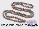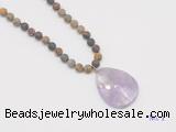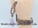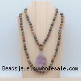 Details: Hand-knotted jasper mala necklaces: 108 8mm/10mm round matte picasso jasper beads with amethyst pendant/12mm guru bead and amethyst pendant (you can choose different pendants, but there will be tiny different in shape & color, we will make the jewelry randomly according to our stock) Item: GMN4416 Material: No.1: 8mm: 108 8mm matte picasso jasper beads & amethyst pendant 10mm: 108 10mm matte picasso jasper beads & amethyst pendant No.2: 8mm: 108 8mm matte picasso jasper beads, 12mm guru bead & amethyst pendant 10mm: 108 10mm matte picasso jasper beads, 12mm guru bead & amethyst pendant Color: See image Length (inch): Necklace length: 8mm: approx 37 - 40 inches (Not including guru bead & pendant) 10mm: approx 46 - 50 inches (Not including guru bead & pendant) Pendants: approx 18*50mm – 25*60mm Quantity Discount Pricing: 1 – 4: None 5 – 49: 95% 50 – 99: 90% 100+: 85% This mala is available in both 8mm and 10mm beads, The listed price is for 1 piece 8mm mala necklace