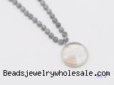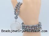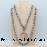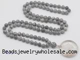 Details: Hand-knotted jasper mala necklaces: 108 8mm/10mm round matte grey picture jasper beads with white crystal pendant/12mm guru bead and white crystal pendant (you can choose different pendants, but there will be tiny different in shape & color, we will make the jewelry randomly according to our stock) Item: GMN4419 Material: No.1: 8mm: 108 8mm matte grey picture jasper beads & white crystal pendant 10mm: 108 10mm matte grey picture jasper beads & white crystal pendant No.2: 8mm: 108 8mm matte grey picture jasper beads, 12mm guru bead & white crystal pendant 10mm: 108 10mm matte grey picture jasper beads, 12mm guru bead & white crystal pendant Color: See image Length (inch): Necklace length: 8mm: approx 37 - 40 inches (Not including guru bead & pendant) 10mm: approx 46 - 50 inches (Not including guru bead & pendant) Pendants: approx 18*50mm – 25*60mm Quantity Discount Pricing: 1 – 4: None 5 – 49: 95% 50 – 99: 90% 100+: 85% This mala is available in both 8mm and 10mm beads, The listed price is for 1 piece 8mm mala necklace