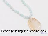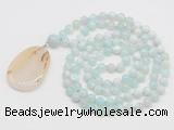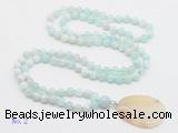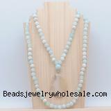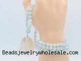 Details: Hand-knotted agate mala necklaces: 108 8mm/10mm round sea blue banded agate beads with montana agate pendant/12mm guru bead and montana agate pendant (you can choose different pendants, but there will be tiny different in shape & color, we will make the jewelry randomly according to our stock) Item: GMN4609 Material: No.1: 8mm: 108 8mm sea blue banded agate beads & montana agate pendant 10mm: 108 10mm sea blue banded agate beads & montana agate pendant No.2: 8mm: 108 8mm sea blue banded agate beads, 12mm guru bead & montana agate pendant 10mm: 108 10mm sea blue banded agate beads, 12mm guru bead & montana agate pendant Color: See image Length (inch): Necklace length: 8mm: approx 37 - 40 inches (Not including guru bead & pendant) 10mm: approx 46 - 50 inches (Not including guru bead & pendant) Pendants: approx 18*50mm – 25*60mm Quantity Discount Pricing: 1 – 4: None 5 – 49: 95% 50 – 99: 90% 100+: 85% This mala is available in both 8mm and 10mm beads, The listed price is for 1 piece 8mm mala necklace
