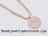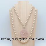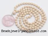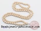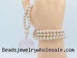 Details: Hand-knotted jasper mala necklaces: 108 8mm/10mm round white fossil jasper beads with rose quartz pendant/12mm guru bead and rose quartz pendant (you can choose different pendants, but there will be tiny different in shape & color, we will make the jewelry randomly according to our stock) Item: GMN4619 Material: No.1: 8mm: 108 8mm white fossil jasper beads & rose quartz pendant 10mm: 108 10mm white fossil jasper beads & rose quartz pendant No.2: 8mm: 108 8mm white fossil jasper beads, 12mm guru bead & rose quartz pendant 10mm: 108 10mm white fossil jasper beads, 12mm guru bead & rose quartz pendant Color: See image Length (inch): Necklace length: 8mm: approx 37 - 40 inches (Not including guru bead & pendant) 10mm: approx 46 - 50 inches (Not including guru bead & pendant) Pendants: approx 18*50mm – 25*60mm Quantity Discount Pricing: 1 – 4: None 5 – 49: 95% 50 – 99: 90% 100+: 85% This mala is available in both 8mm and 10mm beads, The listed price is for 1 piece 8mm mala necklace