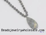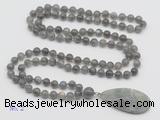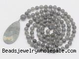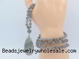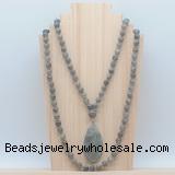 Details: Hand-knotted labradorite mala necklaces: 108 8mm/10mm round labradorite beads with labradorite pendant/12mm guru bead and labradorite pendant (you can choose different pendants, but there will be tiny different in shape & color, we will make the jewelry randomly according to our stock) Item: GMN4634 Material: No.1: 8mm: 108 8mm labradorite beads & labradorite pendant 10mm: 108 10mm labradorite beads & labradorite pendant No.2: 8mm: 108 8mm labradorite beads, 12mm guru bead & labradorite pendant 10mm: 108 10mm labradorite beads, 12mm guru bead & labradorite pendant Color: See image Length (inch): Necklace length: 8mm: approx 37 - 40 inches (Not including guru bead & pendant) 10mm: approx 46 - 50 inches (Not including guru bead & pendant) Pendants: approx 18*50mm – 25*60mm Quantity Discount Pricing: 1 – 4: None 5 – 49: 95% 50 – 99: 90% 100+: 85% This mala is available in both 8mm and 10mm beads, The listed price is for 1 piece 8mm mala necklace