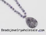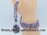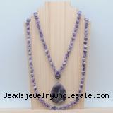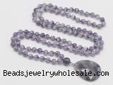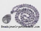Details: Hand-knotted amethyst mala necklaces: 108 8mm/10mm round dogtooth amethyst beads with blue goldstone pendant/12mm guru bead and blue goldstone pendant (you can choose different pendants, but there will be tiny different in shape & color, we will make the jewelry randomly according to our stock) Item: GMN4652 Material: No.1: 8mm: 108 8mm dogtooth amethyst beads & blue goldstone pendant 10mm: 108 10mm dogtooth amethyst beads & blue goldstone pendant No.2: 8mm: 108 8mm dogtooth amethyst beads, 12mm guru bead & blue goldstone pendant 10mm: 108 10mm dogtooth amethyst beads, 12mm guru bead & blue goldstone pendant Color: See image Length (inch): Necklace length: 8mm: approx 37 - 40 inches (Not including guru bead & pendant) 10mm: approx 46 - 50 inches (Not including guru bead & pendant) Quantity Discount Pricing: 1 – 4: None 5 – 49: 95% 50 – 99: 90% 100+: 85% This mala is available in both 8mm and 10mm beads, The listed price is for 1 piece 8mm mala necklace