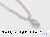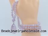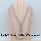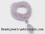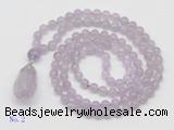 Details: Hand-knotted amethyst mala necklaces: 108 8mm/10mm round lavender amethyst beads with amethyst pendant/12mm guru bead and amethyst pendant (you can choose different pendants, but there will be tiny different in shape & color, we will make the jewelry randomly according to our stock) Item: GMN4902 Material: No.1: 8mm: 108 8mm lavender amethyst beads & amethyst pendant 10mm: 108 10mm lavender amethyst beads & amethyst pendant No.2: 8mm: 108 8mm lavender amethyst beads, 12mm guru bead & amethyst pendant 10mm: 108 10mm lavender amethyst beads, 12mm guru bead & amethyst pendant Color: See image Length (inch): Necklace length: 8mm: approx 37 - 40 inches (Not including guru bead & pendant) 10mm: approx 46 - 50 inches (Not including guru bead & pendant) Pendants: approx 18*35mm - 28*40mm Quantity Discount Pricing: 1 - 4: None 5 - 49: 95% 50 - 99: 90% 100+: 85% This mala is available in both 8mm and 10mm beads, The listed price is for 1 piece 8mm mala necklace