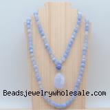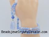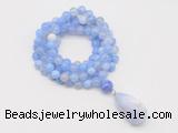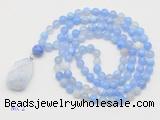 Details: Hand-knotted agate mala necklaces: 108 8mm/10mm round blue banded agate beads with blue lace agate pendant/12mm guru bead and blue lace agate pendant (you can choose different pendants, but there will be tiny different in shape & color, we will make the jewelry randomly according to our stock) Item: GMN4908 Material: No.1: 8mm: 108 8mm blue banded agate beads & blue lace agate pendant 10mm: 108 10mm blue banded agate beads & blue lace agate pendant No.2: 8mm: 108 8mm blue banded agate beads, 12mm guru bead & blue lace agate pendant 10mm: 108 10mm blue banded agate beads, 12mm guru bead & blue lace agate pendant Color: See image Length (inch): Necklace length: 8mm: approx 37 - 40 inches (Not including guru bead & pendant) 10mm: approx 46 - 50 inches (Not including guru bead & pendant) Pendants: approx 18*35mm - 28*40mm Quantity Discount Pricing: 1 - 4: None 5 - 49: 95% 50 - 99: 90% 100+: 85% This mala is available in both 8mm and 10mm beads, The listed price is for 1 piece 8mm mala necklace