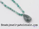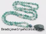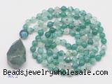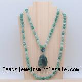 Details: Hand-knotted agate mala necklaces: 108 8mm/10mm round green banded agate beads with moss agate pendant/12mm guru bead and moss agate pendant (you can choose different pendants, but there will be tiny different in shape & color, we will make the jewelry randomly according to our stock) Item: GMN4910 Material: No.1: 8mm: 108 8mm green banded agate beads & moss agate pendant 10mm: 108 10mm green banded agate beads & moss agate pendant No.2: 8mm: 108 8mm green banded agate beads, 12mm guru bead & moss agate pendant 10mm: 108 10mm green banded agate beads, 12mm guru bead & moss agate pendant Color: See image Length (inch): Necklace length: 8mm: approx 37 - 40 inches (Not including guru bead & pendant) 10mm: approx 46 - 50 inches (Not including guru bead & pendant) Pendants: approx 18*35mm - 28*40mm Quantity Discount Pricing: 1 - 4: None 5 - 49: 95% 50 - 99: 90% 100+: 85% This mala is available in both 8mm and 10mm beads, The listed price is for 1 piece 8mm mala necklace