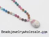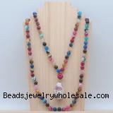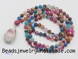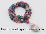 Details: Hand-knotted agate mala necklaces: 108 8mm/10mm round mixed banded agate beads with tourmaline pendant/12mm guru bead and tourmaline pendant (you can choose different pendants, but there will be tiny different in shape & color, we will make the jewelry randomly according to our stock) Item: GMN4911 Material: No.1: 8mm: 108 8mm mixed banded agate beads & tourmaline pendant 10mm: 108 10mm mixed banded agate beads & tourmaline pendant No.2: 8mm: 108 8mm mixed banded agate beads, 12mm guru bead & tourmaline pendant 10mm: 108 10mm mixed banded agate beads, 12mm guru bead & tourmaline pendant Color: See image Length (inch): Necklace length: 8mm: approx 37 - 40 inches (Not including guru bead & pendant) 10mm: approx 46 - 50 inches (Not including guru bead & pendant) Pendants: approx 18*35mm - 28*40mm Quantity Discount Pricing: 1 - 4: None 5 - 49: 95% 50 - 99: 90% 100+: 85% This mala is available in both 8mm and 10mm beads, The listed price is for 1 piece 8mm mala necklace