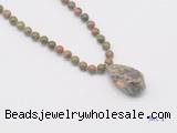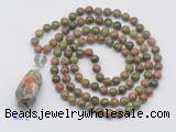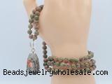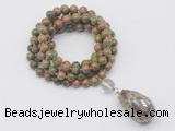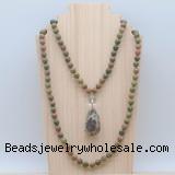 Details: Hand-knotted unakite mala necklaces: 108 8mm/10mm round unakite beads with rainforest agate pendant/12mm white crystal guru bead and rainforest agate pendant (you can choose different pendants, but there will be tiny different in shape & color, we will make the jewelry randomly according to our stock) Item: GMN4926 Material: No.1: 8mm: 108 8mm unakite beads & rainforest agate pendant 10mm: 108 10mm unakite beads & rainforest agate pendant No.2: 8mm: 108 8mm unakite beads, 12mm white crystal guru bead & rainforest agate pendant 10mm: 108 10mm unakite beads, 12mm white crystal guru bead & rainforest agate pendant Color: See image Length (inch): Necklace length: 8mm: approx 37 - 40 inches (Not including guru bead & pendant) 10mm: approx 46 - 50 inches (Not including guru bead & pendant) Pendants: approx 18*35mm - 28*40mm Quantity Discount Pricing: 1 - 4: None 5 - 49: 95% 50 - 99: 90% 100+: 85% This mala is available in both 8mm and 10mm beads, The listed price is for 1 piece 8mm mala necklace