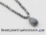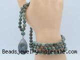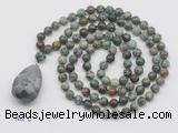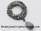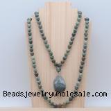 Details: Hand-knotted turquoise mala necklaces: 108 8mm/10mm round African turquoise beads with moss agate pendant/12mm guru bead and moss agate pendant (you can choose different pendants, but there will be tiny different in shape & color, we will make the jewelry randomly according to our stock) Item: GMN4929 Material: No.1: 8mm: 108 8mm African turquoise beads & moss agate pendant 10mm: 108 10mm African turquoise beads & moss agate pendant No.2: 8mm: 108 8mm African turquoise beads, 12mm guru bead & moss agate pendant 10mm: 108 10mm African turquoise beads, 12mm guru bead & moss agate pendant Color: See image Length (inch): Necklace length: 8mm: approx 37 - 40 inches (Not including guru bead & pendant) 10mm: approx 46 - 50 inches (Not including guru bead & pendant) Pendants: approx 18*35mm - 28*40mm Quantity Discount Pricing: 1 - 4: None 5 - 49: 95% 50 - 99: 90% 100+: 85% This mala is available in both 8mm and 10mm beads, The listed price is for 1 piece 8mm mala necklace