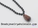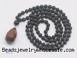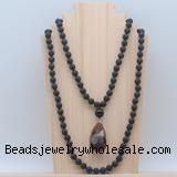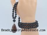 Details: Hand-knotted lava mala necklaces: 108 8mm/10mm round black lava beads with mahogany obsidian pendant/12mm guru bead and mahogany obsidian pendant (you can choose different pendants, but there will be tiny different in shape & color, we will make the jewelry randomly according to our stock) Item: GMN4933 Material: No.1: 8mm: 108 8mm black lava beads & mahogany obsidian pendant 10mm: 108 10mm black lava beads & mahogany obsidian pendant No.2: 8mm: 108 8mm black lava beads, 12mm guru bead & mahogany obsidian pendant 10mm: 108 10mm black lava beads, 12mm guru bead & mahogany obsidian pendant Color: See image Length (inch): Necklace length: 8mm: approx 37 - 40 inches (Not including guru bead & pendant) 10mm: approx 46 - 50 inches (Not including guru bead & pendant) Pendants: approx 18*35mm - 28*40mm Quantity Discount Pricing: 1 - 4: None 5 - 49: 95% 50 - 99: 90% 100+: 85% This mala is available in both 8mm and 10mm beads, The listed price is for 1 piece 8mm mala necklace