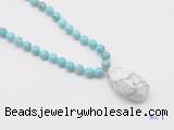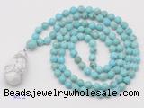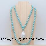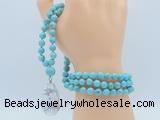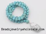 Details: Hand-knotted turquoise mala necklaces: 108 8mm/10mm round blue howlite beads with white howlite pendant/12mm guru bead and white howlite pendant (you can choose different pendants, but there will be tiny different in shape & color, we will make the jewelry randomly according to our stock) Item: GMN4944 Material: No.1: 8mm: 108 8mm blue howlite beads & white howlite pendant 10mm: 108 10mm blue howlite beads & white howlite pendant No.2: 8mm: 108 8mm white howlite beads, 12mm guru bead & white howlite pendant 10mm: 108 10mm white howlite beads, 12mm guru bead & white howlite pendant Color: See image Length (inch): Necklace length: 8mm: approx 37 - 40 inches (Not including guru bead & pendant) 10mm: approx 46 - 50 inches (Not including guru bead & pendant) Pendants: approx 18*35mm - 28*40mm Quantity Discount Pricing: 1 - 4: None 5 - 49: 95% 50 - 99: 90% 100+: 85% This mala is available in both 8mm and 10mm beads, The listed price is for 1 piece 8mm mala necklace