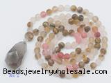 Details: Hand-knotted quartz mala necklaces: 108 8mm/10mm round matte volcano cherry quartz beads with smoky quartz pendant/12mm guru bead and smoky quartz pendant (you can choose different pendants, but there will be tiny different in shape & color, we will make the jewelry randomly according to our stock) Item: GMN5001 Material: No.1: 8mm: 108 8mm matte volcano cherry quartz beads & smoky quartz pendant 10mm: 108 10mm matte volcano cherry quartz beads & smoky quartz pendant No.2: 8mm: 108 8mm matte volcano cherry quartz beads, 12mm guru bead & smoky quartz pendant 10mm: 108 10mm matte volcano cherry quartz beads, 12mm guru bead & smoky quartz pendant Color: See image Length (inch): Necklace length: 8mm: approx 37 - 40 inches (Not including guru bead & pendant) 10mm: approx 46 - 50 inches (Not including guru bead & pendant) Pendants: approx 18*35mm - 28*40mm Quantity Discount Pricing: 1 – 4: None 5 – 49: 95% 50 – 99: 90% 100+: 85% This mala is available in both 8mm and 10mm beads, The listed price is for 1 piece 8mm mala necklace