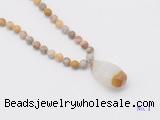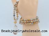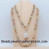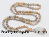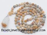 Details: Hand-knotted agate mala necklaces: 108 8mm/10mm round matte yellow crazy lace agate beads with agate pendant/12mm guru bead and agate pendant (you can choose different pendants, but there will be tiny different in shape & color, we will make the jewelry randomly according to our stock) Item: GMN5011 Material: No.1: 8mm: 108 8mm matte yellow crazy lace agate beads & agate pendant 10mm: 108 10mm matte yellow crazy lace agate beads & agate pendant No.2: 8mm: 108 8mm matte yellow crazy lace agate beads, 12mm guru bead & agate pendant 10mm: 108 10mm matte yellow crazy lace agate beads, 12mm guru bead & agate pendant Color: See image Length (inch): Necklace length: 8mm: approx 37 - 40 inches (Not including guru bead & pendant) 10mm: approx 46 - 50 inches (Not including guru bead & pendant) Pendants: approx 18*35mm - 28*40mm Quantity Discount Pricing: 1 – 4: None 5 – 49: 95% 50 – 99: 90% 100+: 85% This mala is available in both 8mm and 10mm beads, The listed price is for 1 piece 8mm mala necklace