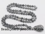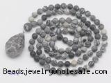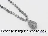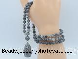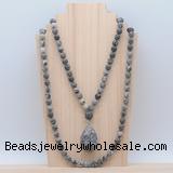 Details: Hand-knotted jasper mala necklaces: 108 8mm/10mm round matte black water jasper beads with fossil jasper pendant/12mm guru bead and fossil jasper pendant (you can choose different pendants, but there will be tiny different in shape & color, we will make the jewelry randomly according to our stock) Item: GMN5021 Material: No.1: 8mm: 108 8mm matte black water jasper beads & fossil jasper pendant 10mm: 108 10mm matte black water jasper beads & fossil jasper pendant No.2: 8mm: 108 8mm matte black water jasper beads, 12mm guru bead & fossil jasper pendant 10mm: 108 10mm matte black water jasper beads, 12mm guru bead & fossil jasper pendant Color: See image Length (inch): Necklace length: 8mm: approx 37 - 40 inches (Not including guru bead & pendant) 10mm: approx 46 - 50 inches (Not including guru bead & pendant) Pendants: approx 18*35mm - 28*40mm Quantity Discount Pricing: 1 – 4: None 5 – 49: 95% 50 – 99: 90% 100+: 85% This mala is available in both 8mm and 10mm beads, The listed price is for 1 piece 8mm mala necklace