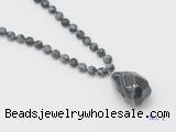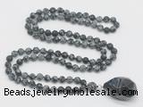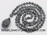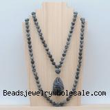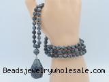Details: Hand-knotted obsidian mala necklaces: 108 8mm/10mm round matte snowflake obsidian beads with agate pendant/12mm guru bead and black & white jasper pendant (you can choose different pendants, but there will be tiny different in shape & color, we will make the jewelry randomly according to our stock) Item: GMN5022 Material: No.1: 8mm: 108 8mm matte snowflake obsidian beads & agate pendant 10mm: 108 10mm matte snowflake obsidian beads & agate pendant No.2: 8mm: 108 8mm matte snowflake obsidian beads, 12mm guru bead & agate pendant 10mm: 108 10mm matte snowflake obsidian beads, 12mm guru bead & agate pendant Color: See image Length (inch): Necklace length: 8mm: approx 37 - 40 inches (Not including guru bead & pendant) 10mm: approx 46 - 50 inches (Not including guru bead & pendant) Pendants: approx 18*35mm - 28*40mm Quantity Discount Pricing: 1 – 4: None 5 – 49: 95% 50 – 99: 90% 100+: 85% This mala is available in both 8mm and 10mm beads, The listed price is for 1 piece 8mm mala necklace