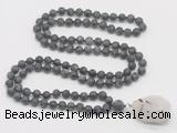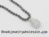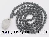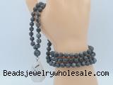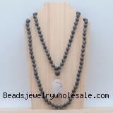 Details: Hand-knotted labradorite mala necklaces: 108 8mm/10mm round matte black labradorite beads with black rutilated quartz pendant/12mm guru bead and black rutilated quartz pendant (you can choose different pendants, but there will be tiny different in shape & color, we will make the jewelry randomly according to our stock) Item: GMN5023 Material: No.1: 8mm: 108 8mm matte black labradorite beads & black rutilated quartz pendant 10mm: 108 10mm matte black labradorite beads & black rutilated quartz pendant No.2: 8mm: 108 8mm matte black labradorite beads, 12mm guru bead & black rutilated quartz pendant 10mm: 108 10mm matte black labradorite beads, 12mm guru bead & black rutilated quartz pendant Color: See image Length (inch): Necklace length: 8mm: approx 37 - 40 inches (Not including guru bead & pendant) 10mm: approx 46 - 50 inches (Not including guru bead & pendant) Pendants: approx 18*35mm - 28*40mm Quantity Discount Pricing: 1 – 4: None 5 – 49: 95% 50 – 99: 90% 100+: 85% This mala is available in both 8mm and 10mm beads, The listed price is for 1 piece 8mm mala necklace
