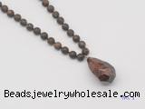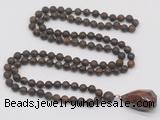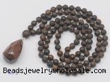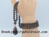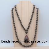 Details: Hand-knotted bronzite mala necklaces: 108 8mm/10mm round matte bronzite beads with l mahogany obsidian pendant/12mm guru bead and mahogany obsidian pendant (you can choose different pendants, but there will be tiny different in shape & color, we will make the jewelry randomly according to our stock) Item: GMN5024 Material: No.1: 8mm: 108 8mm matte bronzite beads & mahogany obsidian pendant 10mm: 108 10mm matte bronzite beads & mahogany obsidian pendant No.2: 8mm: 108 8mm matte bronzite beads, 12mm guru bead & mahogany obsidian pendant 10mm: 108 10mm matte bronzite beads, 12mm guru bead & mahogany obsidian pendant Color: See image Length (inch): Necklace length: 8mm: approx 37 - 40 inches (Not including guru bead & pendant) 10mm: approx 46 - 50 inches (Not including guru bead & pendant) Pendants: approx 18*35mm - 28*40mm Quantity Discount Pricing: 1 – 4: None 5 – 49: 95% 50 – 99: 90% 100+: 85% This mala is available in both 8mm and 10mm beads, The listed price is for 1 piece 8mm mala necklace