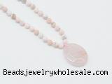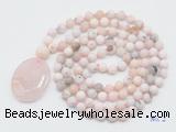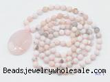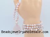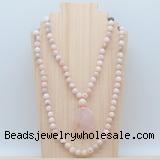 Details: Hand-knotted opal mala necklaces: 108 8mm/10mm round matte natural pink opal beads with rose quartz pendant/12mm guru bead and rose quartz pendant (you can choose different pendants, but there will be tiny different in shape & color, we will make the jewelry randomly according to our stock) Item: GMN5057 Material: No.1: 8mm: 108 8mm matte natural pink opal beads & rose quartz pendant 10mm: 108 10mm matte natural pink opal beads & rose quartz pendant No.2: 8mm: 108 8mm matte natural pink opal beads, 12mm guru bead & rose quartz pendant 10mm: 108 10mm matte natural pink opal beads, 12mm guru bead & rose quartz pendant Color: See image Length (inch): Necklace length: 8mm: approx 37 - 40 inches (Not including guru bead & pendant) 10mm: approx 46 - 50 inches (Not including guru bead & pendant) Quantity Discount Pricing: 1 - 4: None 5 - 49: 95% 50 - 99: 90% 100+: 85% This mala is available in both 8mm and 10mm beads, The listed price is for 1 piece 8mm mala necklace