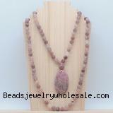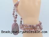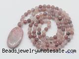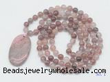 Details: Hand-knotted quartz mala necklaces: 108 8mm/10mm round purple strawberry quartz beads with rhodonite pendant/12mm guru bead and rhodonite pendant (you can choose different pendants, but there will be tiny different in shape & color, we will make the jewelry randomly according to our stock) Item: GMN5060 Material: No.1: 8mm: 108 8mm purple strawberry quartz beads & rhodonite pendant 10mm: 108 10mm purple strawberry quartz beads & rhodonite pendant No.2: 8mm: 108 8mm purple strawberry quartz beads, 12mm guru bead & rhodonite pendant 10mm: 108 10mm purple strawberry quartz beads, 12mm guru bead & rhodonite pendant Color: See image Length (inch): Necklace length: 8mm: approx 37 - 40 inches (Not including guru bead & pendant) 10mm: approx 46 - 50 inches (Not including guru bead & pendant) Quantity Discount Pricing: 1 - 4: None 5 - 49: 95% 50 - 99: 90% 100+: 85% This mala is available in both 8mm and 10mm beads, The listed price is for 1 piece 8mm mala necklace