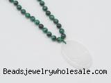 Details: Hand-knotted tiger eye mala necklaces: 108 8mm/10mm round green tiger eye beads with white crystal pendant/12mm guru bead and white crystal pendant (you can choose different pendants, but there will be tiny different in shape & color, we will make the jewelry randomly according to our stock) Item: GMN5067 Material: No.1: 8mm: 108 8mm blue tiger eye beads & white crystal pendant 10mm: 108 10mm blue tiger eye beads & white crystal pendant No.2: 8mm: 108 8mm blue tiger eye beads, 12mm guru bead & white crystal pendant 10mm: 108 10mm blue tiger eye beads, 12mm guru bead & white crystal pendant Color: See image Length (inch): Necklace length: 8mm: approx 37 - 40 inches (Not including guru bead & pendant) 10mm: approx 46 - 50 inches (Not including guru bead & pendant) Quantity Discount Pricing: 1 - 4: None 5 - 49: 95% 50 - 99: 90% 100+: 85% This mala is available in both 8mm and 10mm beads, The listed price is for 1 piece 8mm mala necklace