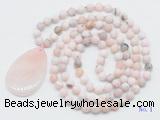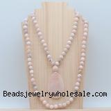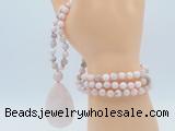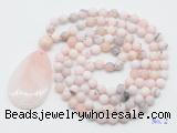 Details: Hand-knotted opal mala necklaces: 108 8mm/10mm round matte natural pink opal beads with rose quartz pendant/12mm guru bead and rose quartz pendant (you can choose different pendants, but there will be tiny different in shape & color, we will make the jewelry randomly according to our stock) Item: GMN5087 Material: No.1: 8mm: 108 8mm matte natural pink opal beads & rose quartz pendant 10mm: 108 10mm matte natural pink opal beads & rose quartz pendant No.2: 8mm: 108 8mm matte natural pink opal beads, 12mm guru bead & rose quartz pendant 10mm: 108 10mm matte natural pink opal beads, 12mm guru bead & rose quartz pendant Color: See image Length (inch): Necklace length: 8mm: approx 37 - 40 inches (Not including guru bead & pendant) 10mm: approx 46 - 50 inches (Not including guru bead & pendant) Quantity Discount Pricing: 1 - 4: None 5 - 49: 95% 50 - 99: 90% 100+: 85% This mala is available in both 8mm and 10mm beads, The listed price is for 1 piece 8mm mala necklace
