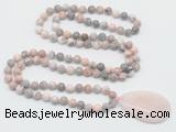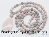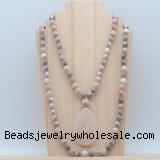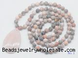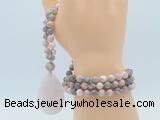 Details: Hand-knotted jasper mala necklaces: 108 8mm/10mm round pink zebra jasper beads with rose quartz pendant/12mm guru bead and rose quartz pendant (you can choose different pendants, but there will be tiny different in shape & color, we will make the jewelry randomly according to our stock) Item: GMN5088 Material: No.1: 8mm: 108 8mm pink zebra jasper beads & rose quartz pendant 10mm: 108 10mm pink zebra jasper beads & rose quartz pendant No.2: 8mm: 108 8mm pink zebra jasper beads, 12mm guru bead & rose quartz pendant 10mm: 108 10mm pink zebra jasper beads, 12mm guru bead & rose quartz pendant Color: See image Length (inch): Necklace length: 8mm: approx 37 - 40 inches (Not including guru bead & pendant) 10mm: approx 46 - 50 inches (Not including guru bead & pendant) Quantity Discount Pricing: 1 - 4: None 5 - 49: 95% 50 - 99: 90% 100+: 85% This mala is available in both 8mm and 10mm beads, The listed price is for 1 piece 8mm mala necklace