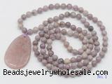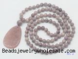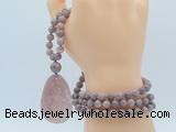 Details: Hand-knotted lepidolite mala necklaces: 108 8mm/10mm round lepidolite beads with strawberry quartz pendant/12mm guru bead and strawberry quartz pendant (you can choose different pendants, but there will be tiny different in shape & color, we will make the jewelry randomly according to our stock) Item: GMN5089 Material: No.1: 8mm: 108 8mm lepidolite beads & strawberry quartz pendant 10mm: 108 10mm lepidolite beads & strawberry quartz pendant No.2: 8mm: 108 8mm lepidolite beads, 12mm guru bead & strawberry quartz pendant 10mm: 108 10mm lepidolite beads, 12mm guru bead & strawberry quartz pendant Color: See image Length (inch): Necklace length: 8mm: approx 37 - 40 inches (Not including guru bead & pendant) 10mm: approx 46 - 50 inches (Not including guru bead & pendant) Quantity Discount Pricing: 1 - 4: None 5 - 49: 95% 50 - 99: 90% 100+: 85% This mala is available in both 8mm and 10mm beads, The listed price is for 1 piece 8mm mala necklace