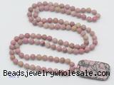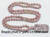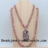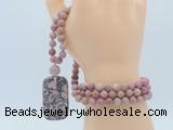 Details: Hand-knotted jasper mala necklaces: 108 8mm/10mm round matte pink wooden fossil jasper beads with rhodonite pendant/12mm guru bead and rhodonite pendant (you can choose different pendants, but there will be tiny different in shape & color, we will make the jewelry randomly according to our stock) Item: GMN5120 Material: No.1: 8mm: 108 8mm matte pink wooden fossil jasper beads & rhodonite pendant 10mm: 108 10mm matte pink wooden fossil jasper beads & rhodonite pendant No.2: 8mm: 108 8mm matte pink wooden fossil jasper beads, 12mm guru bead & rhodonite pendant 10mm: 108 10mm matte pink wooden fossil jasper beads, 12mm guru bead & rhodonite pendant Color: See image Length (inch): Necklace length: 8mm: approx 37 - 40 inches (Not including guru bead & pendant) 10mm: approx 46 - 50 inches (Not including guru bead & pendant) Quantity Discount Pricing: 1 – 4: None 5 – 49: 95% 50 – 99: 90% 100+: 85% This mala is available in both 8mm and 10mm beads, The listed price is for 1 piece 8mm mala necklace